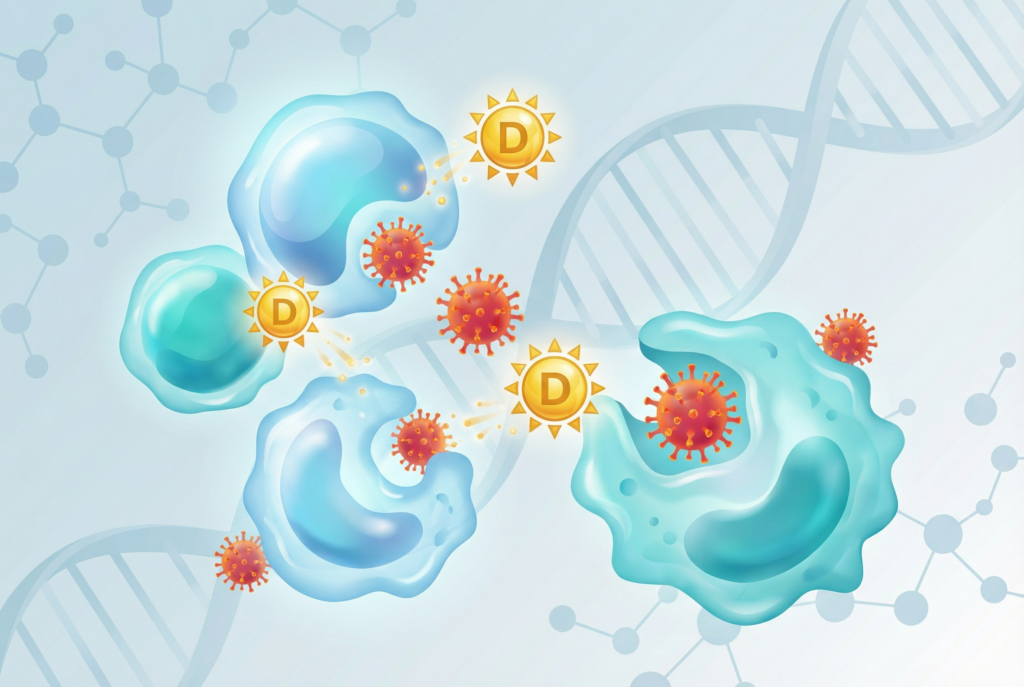 Vitamin D aktivira obrambne celice telesa, ki se borijo proti bakterijam in virusom. Raziskave kažejo, da lahko ustrezna raven vitamina D zmanjša tveganje za okužbe dihal za do 35 %. Pomanjkanje vitamina D je povezano s pogostejšimi prehladnimi obolenji in gripo, kar pojasnjuje, zakaj smo pozimi bolj nagnjeni k okužbam.