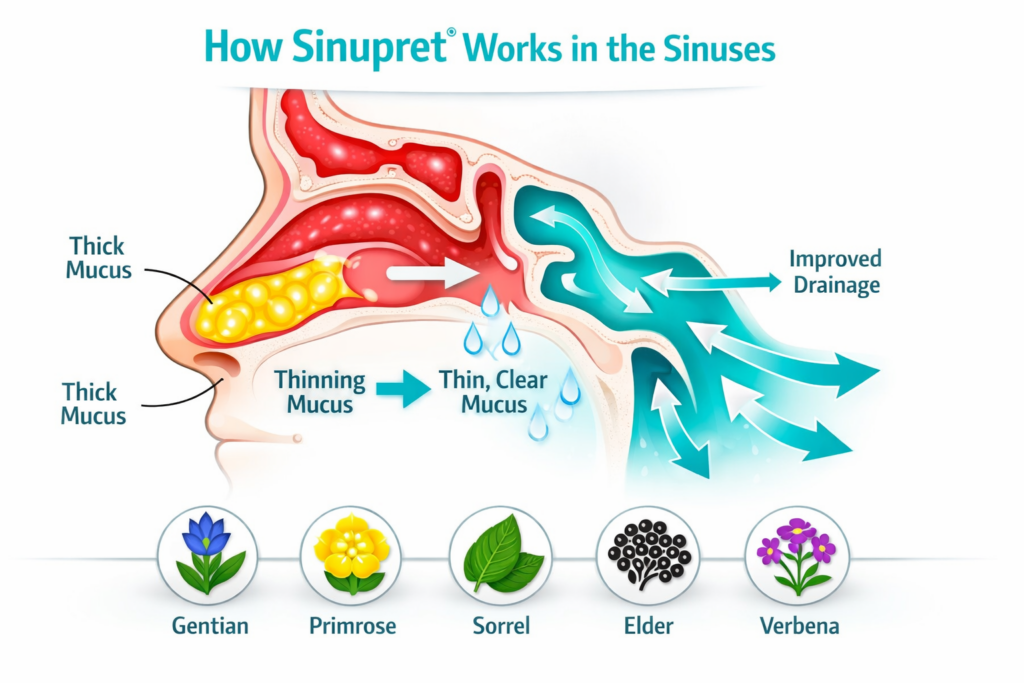 Sinupret razredči gosto sluz (sekretolitični učinek) in spodbuja njeno gibanje iz obnosnih votlin (sekretomotorični učinek) [11]. S tem preprečuje zastajanje sluzi, ki bi lahko postala gojišče za bakterije.