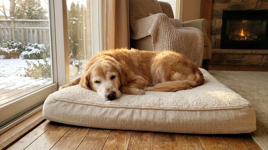Trda, hladna tla poslabšajo sklepne bolečine. Zagotovite svojemu psu mehko ležišče z dobro oporo, idealno ortopedsko ležišče iz spominske pene, ki enakomerno porazdeli pritisk na telo. Grelne blazine, posebej zasnovane za hišne ljubljenčke, lahko zagotavljajo dodatno toploto, vendar jih vedno uporabljajte varno in pod nadzorom.