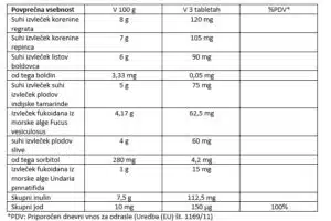 Sestavine: polnila: mikrokristalna celuloza, dikalcijev fosfat; suhi izvleček korenine regrata (Taraxacum campylodes sin. Taraxacum officinale) standardiziran na 2 % inulina, inulin, suhi izvleček korenine repinca (Arctium lappa L.) standardiziran na 2 % inulina, suhi izvleček listov boldovca (Peumus boldus Molina) standardiziran na 0,05 % boldina, suhi izvleček plodov indijske tamarinde (Tamarindus indica L.), izvleček fukoidana iz morske alge Fucus vesiculosus standardiziran na 0,12 % joda, suhi izvleček plodov slive (Prunus domestica) standardiziran na 7 % sorbitola, izvleček fukoidana iz morske alge Undaria pinnatifida (Harvey) Suringar sin. Alaria pinnatifida Harvey stadardiziran na 0,5% joda, sredstva proti sprijemanju: silicijev dioksid, magnezijev stearat.